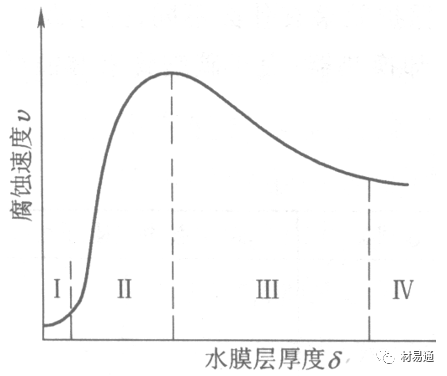 4)区域IV 金属表面水膜厚度大于1mm,相当于全浸在电解液中的腐蚀,腐蚀速度基本不变。