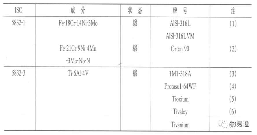 常用金属植入材料有不锈钢、钴铬钼合金及钛合金。