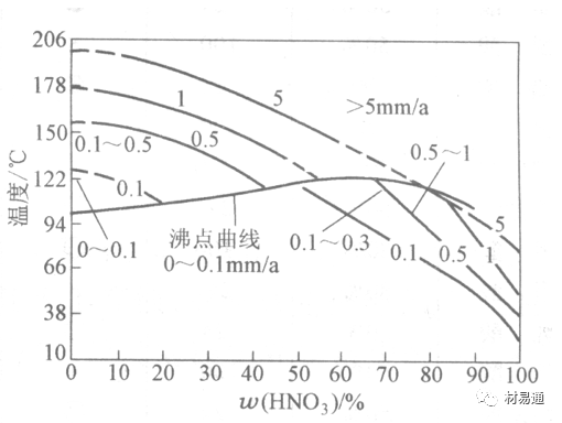 硝酸质量分数低于30%时,碳钢的腐蚀速度随酸浓度增加而增加,当质量分数约在30%附近时腐蚀速度达到最大值。