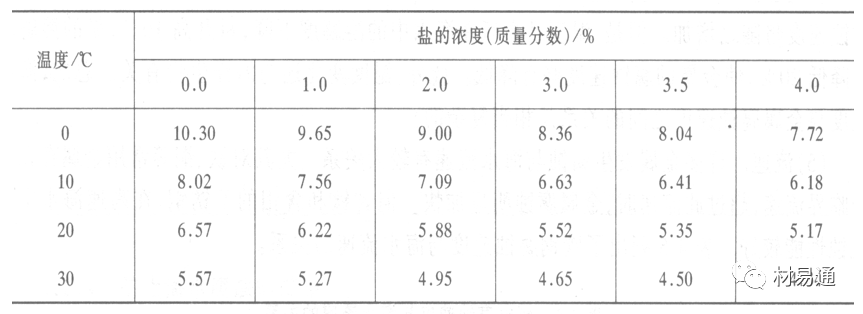海水中溶解氧,是海水腐蚀的重要因素。正常情况下海水表面层被空气饱和,氧的浓度随水温一般在(5~10)×10-6cm3/L范围内变化。由表看出盐的浓度和温度愈高,氧的溶解度愈小。