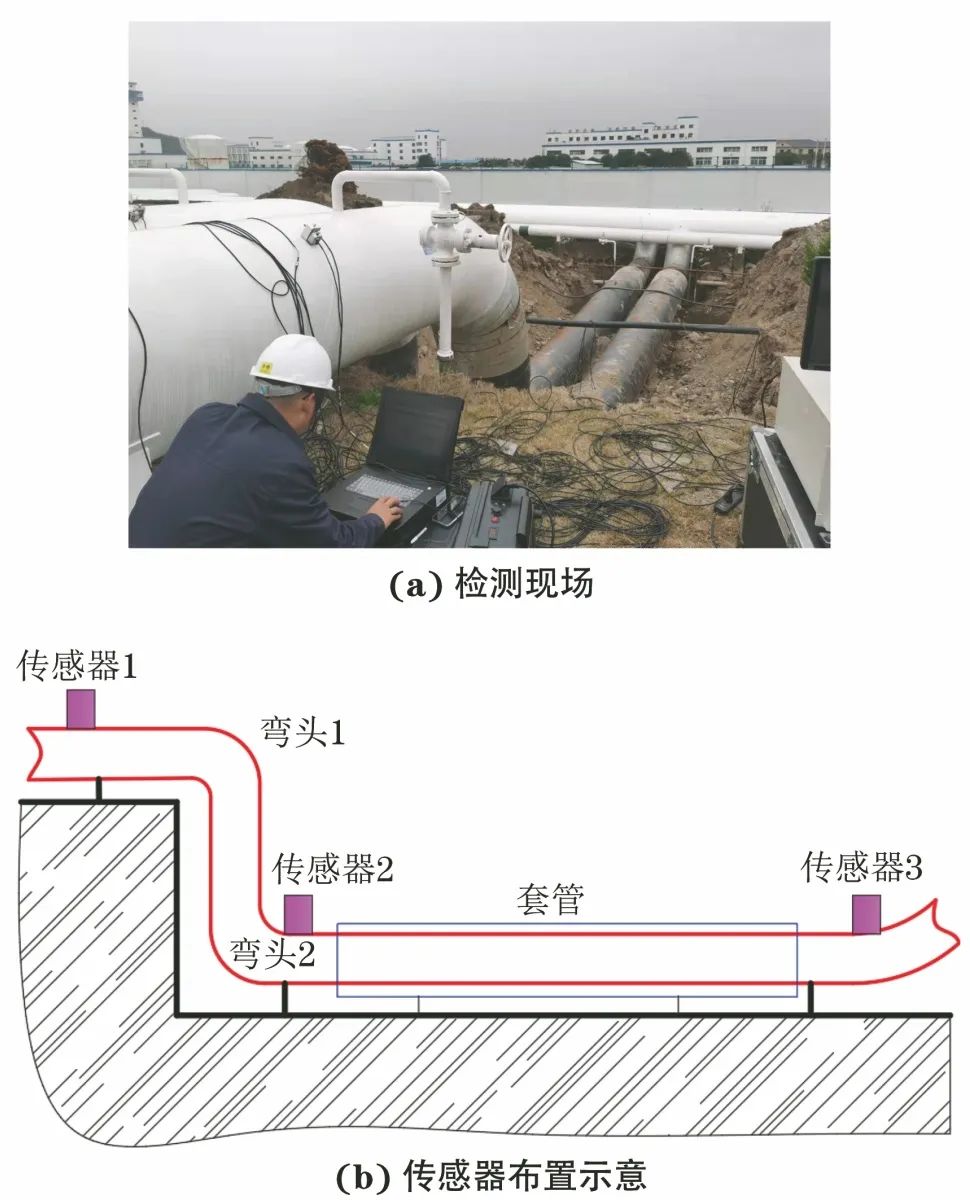 2021年3月该企业进行埋地管道开挖检修作业,此时分别在管道两端及底部各布置一个传感器,对管道进行声信号传播距离衰减测试、腐蚀缺陷声发射特征参数表征、传感器布置优化方案测试等。