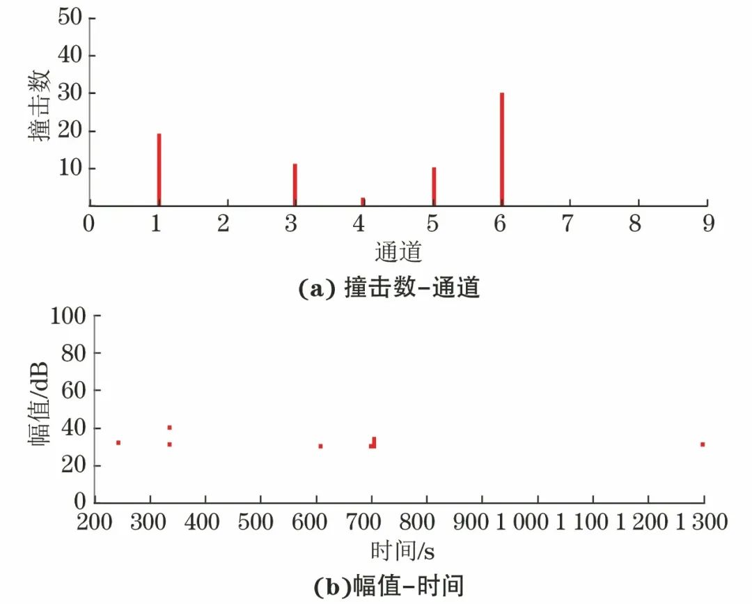 在管道两端的环向各布置3个传感器,进而对这段管道进行在线监测,从25 min内采集到的声发射数据可以看出(见图4),撞击数只有30,幅值均不大于40 dB,表明在有效的检测覆盖范围内,该段管道的腐蚀状况良好(这主要是由于该段管道重新进行了清污理和防腐处理,管道近似新装状态)。由于实际检测过程中,声发射源产生的位置位于1号和3号传感器之间,其传播距离要小于该节试验1和试验2的24.1 m,因此其检测可靠性也更高。