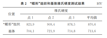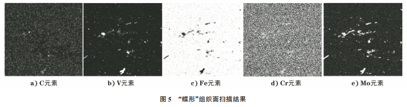 对白色“蝶形”组织与附近基体组织进行能谱分析,面扫描结果如图5所示。“蝶形”组织及附近基体元素质量分数如表1所示,由表1可知:“蝶形”组织元素组成与基体无明显差异,表明“蝶形”组织在形成过程中不存在元素的偏聚,基体之间无明显的元素迁移现象。