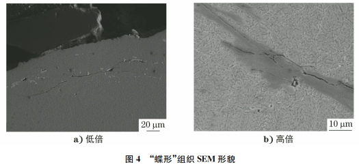 对外圈滚道剥落区域的白色“蝶形”组织进行观察,“蝶形”组织SEM形貌如图4所示,由图4可知:“蝶形”组织内部含有较多微裂纹,内部裂纹沿着“蝶形”组织与基体的交界处或“蝶形”组织内的碳化物扩展,且随着“蝶形”组织的双翼扩展,多处裂纹存在树枝状分叉现象。