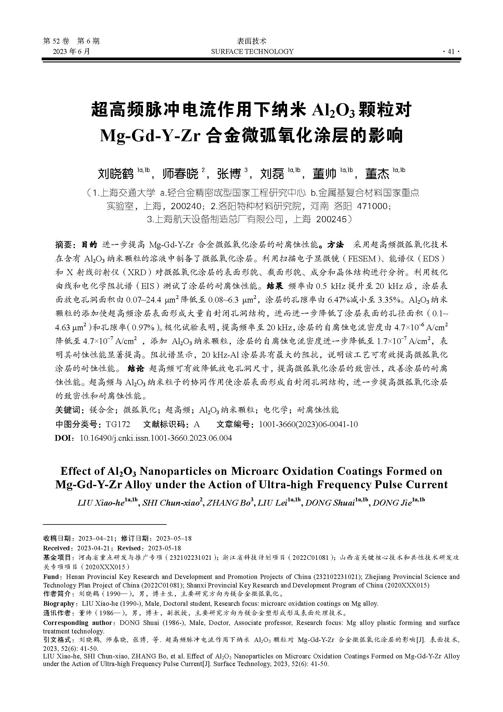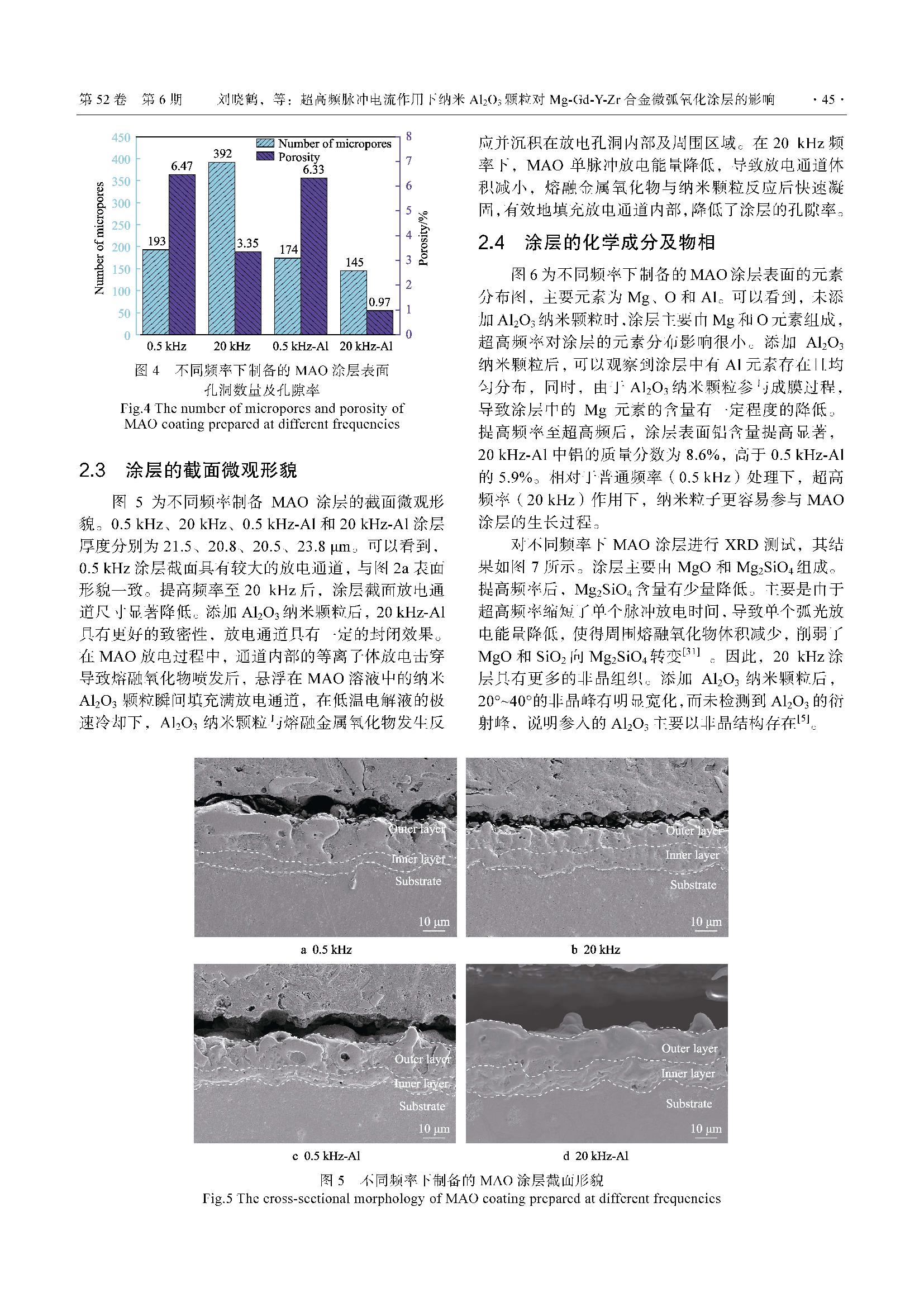 超高频脉冲电流作用下纳米Al2O3 颗粒对Mg-Gd-Y-Zr 合金微弧氧化涂层的影响