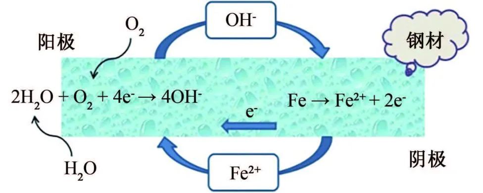 钢材的腐蚀机理如图1所示,腐蚀损伤程度与所处环境、材料类别和服役周期等因素密切相关。一般而言,构件焊接区域的腐蚀速率普遍大于母材区,该区域材料损伤累积导致工程结构体系的极限承载力降低;此外,与普通建筑钢材相比,高强钢特定的冶炼方式及轧制工艺不仅提高了材料的力学性能,并且明显改善了材料的耐蚀性。