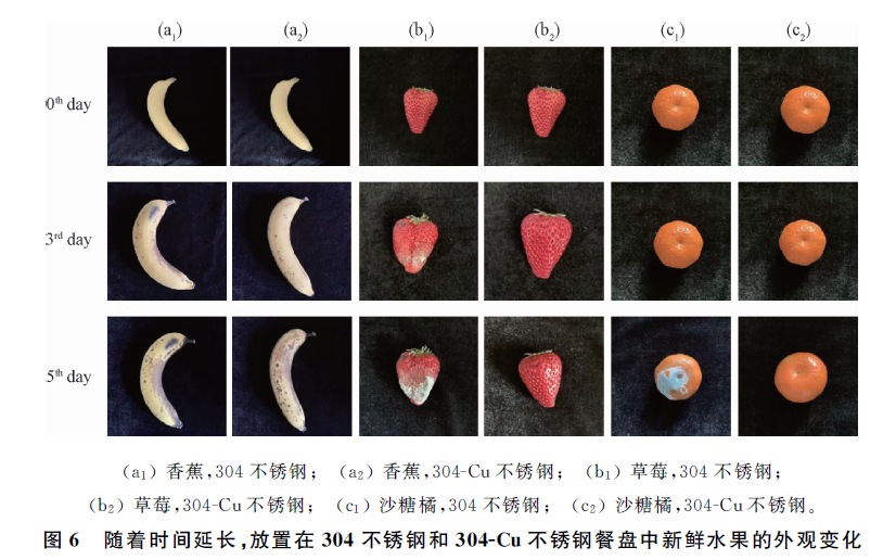 含Cu抗菌不锈钢在 日常生活中的应用研究现状 厨房器具 研究发现,在食品保存环境中,细菌群体感应与生物膜的形成存在紧密联系,细菌通过产生、释放和检测自诱导信号分子来监测细菌群体密度变化,使菌群累积到一定数量阈值后能够执行集体行为。中科院金属所杨柯团队通过选用食品腐败菌及致病菌中通用的自诱导信号分子,研究了304-Cu不锈钢对细菌的抑制作用,并通过恶化食品保存条件,初步研究了含Cu抗菌不锈钢的保鲜作用。试验结果表明,在接触周期内,304-Cu不锈钢不仅能抑制食品中细菌微生物的活性,同时还能以淬灭AI-2信号为靶点,抑制食品腐败菌腐败性状的表达及生物膜的形成,因而可降低微生物通过分离分散导致周围环境的生物污染,形成有效的抑菌氛围,如图5所示。 此外,通过模拟食品的真实保存过程,监测了分别放置在304不锈钢和304-Cu不锈钢餐盘中生鲜和熟制食品的表面形貌与理化指标变化,宏观现象表现为,放置在304-Cu不锈钢餐盘中的新鲜水果(图6)、冷鲜肉、熟制蔬菜、熏煮火腿在接触期内的理化指标均能达到国标要求,因而显著延长了食品的保鲜时间。进一步的试验证实,在营养丰富的环境中,304-Cu不锈钢能抑制优势细菌的形成及繁殖,削弱食品在材料表面上的黏附,因而控制了微生物的污染与传播。这为含Cu抗菌不锈钢在食品领域中的应用提供了科学依据,是抗菌不锈钢应用的一个新的重要方向。 建筑装饰