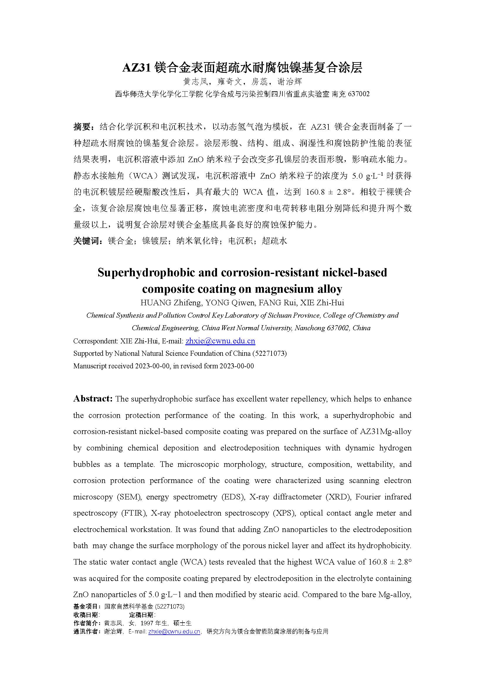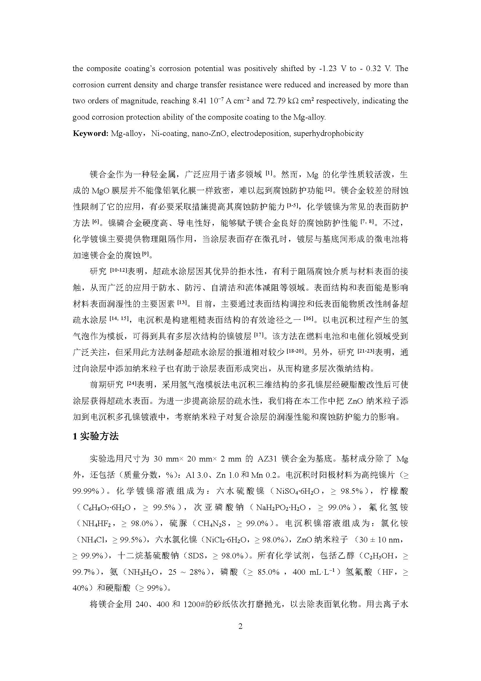 AZ31 镁合金表面超疏水耐腐蚀镍基复合涂层