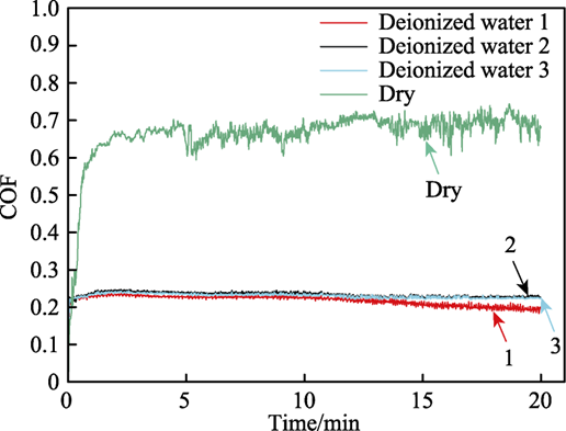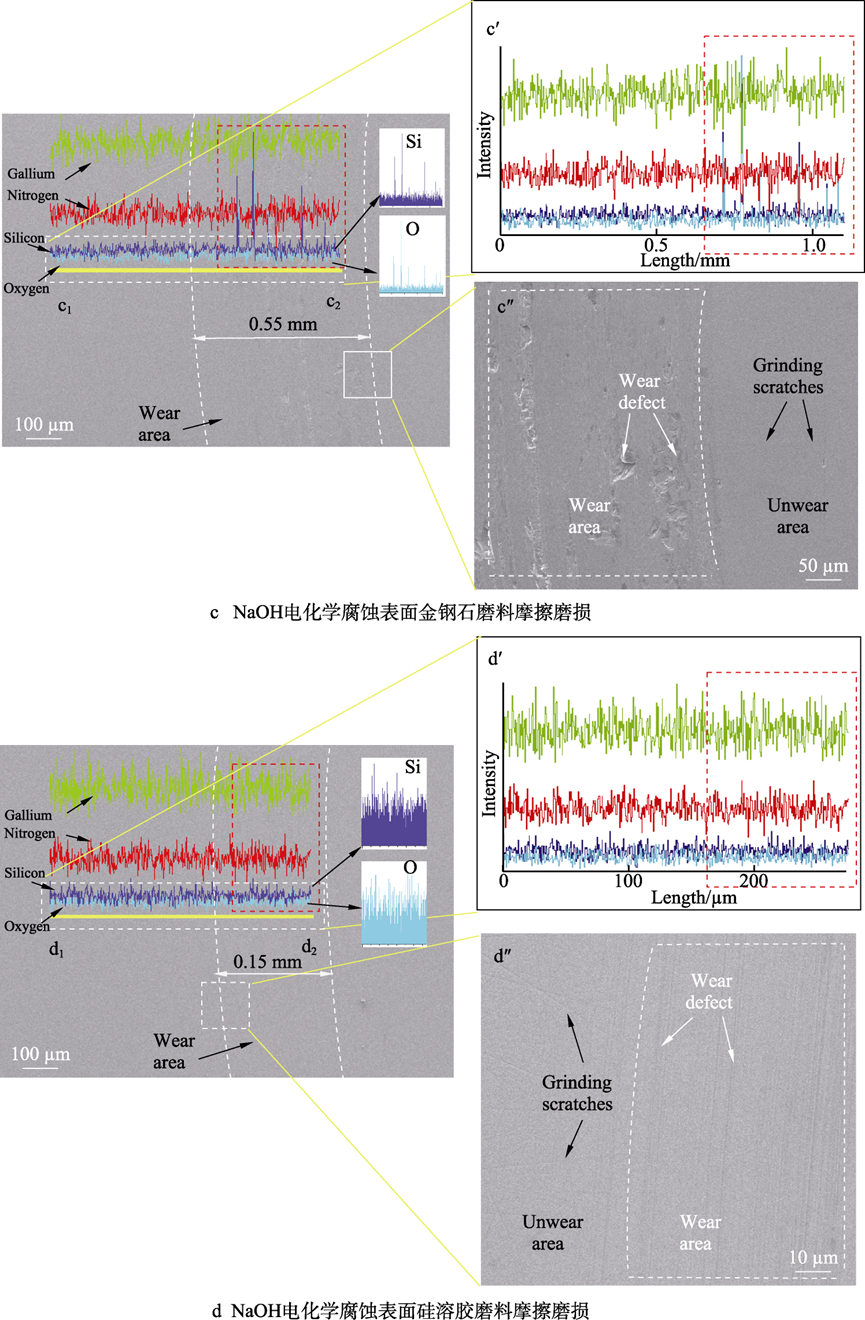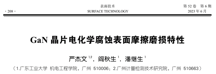 关键词:GaN晶片;电化学;腐蚀;摩擦磨损;摩擦因数;微观形貌 不同介质环境下GaN晶片摩擦因数曲线 不同电解质溶液电化学腐蚀GaN晶片的摩擦因数曲线 不同电解质溶液电化学腐蚀摩擦磨损沟槽截面图 不同电位下电化学腐蚀GaN晶面摩擦因数曲线 不同磨料对腐蚀面摩擦磨损沟槽截面图 不同电解质溶液的极化曲线 不同GaN晶片表面摩擦磨损区域形貌分析 不同腐蚀电位的电化学腐蚀磨损痕SEM形貌 通过GaN晶片的摩擦磨损实验,研究了不同介质环境下GaN晶片表面磨损的摩擦因数及磨痕形貌,进一步研究了电化学作用下不同电解质溶液电化学腐蚀、不同腐蚀电位电化学腐蚀GaN晶片表面的摩擦磨损特性,最后探讨了磨料的引入对GaN晶片表面摩擦磨损特性的影响,得出以下结论。 1)在摩擦磨损过程中,介质环境对表面摩擦的影响较大。在干摩擦环境时摩擦因数约为0.6,且摩擦因数曲线波动较大。在去离子水介质环境下,摩擦因数约为0.2,摩擦因数曲线相对平稳,说明在摩擦过程中水介质起到了润滑作用。 2)GaN晶片经电化学腐蚀后,其摩擦因数比未腐蚀晶片的摩擦因数大。不同电解质电化学腐蚀GaN晶片的摩擦因数曲线相互交叉,NaOH溶液电化学腐蚀表面磨痕沟槽的深度、宽度、磨损率最大,其次为Na2S2O8电化学腐蚀表面,最后为H3PO4电化学腐蚀表面。在GaN晶片表面磨痕区域,材料破损缺陷存在明显差异,NaOH溶液电化学腐蚀表面的材料脆性破损缺陷区域最大,Na2S2O8溶液和H3PO4溶液电化学腐蚀表面材料脆性破损缺陷区域较小。由电化学腐蚀极化曲线塔菲尔外推法得到的腐蚀速率实验结果表明,在电化学过程中GaN晶片的腐蚀速率依次为NaOH>Na2S2O8>H3PO4。NaOH溶液电化学腐蚀面的磨损程度最大,说明电化学腐蚀作用有效提高了表面摩擦磨损率。 3)随着电化学腐蚀电位的增大,GaN晶片腐蚀表面摩擦因数呈逐渐增大趋势,摩擦表面磨痕沟槽尺寸、磨损率逐渐变大。通过观察摩擦痕表面微观结构发现,腐蚀电位越高,磨痕区域内材料破损缺陷越多,材料脆性断裂去除的形式越强。说明腐蚀电位越高,表面电化学腐蚀作用越强,在摩擦过程中磨痕表面材料脆性断裂形式越明显。 4)磨料对电化学腐蚀表面摩擦实验的影响差异较大。硬质金刚石磨料能极大地增加磨损区域磨痕尺寸和磨损率,在磨损区域材料破损缺陷增多,磨损缺陷材料去除主要为脆性断裂形式。在软质球形硅溶胶磨料的表面磨痕区域未见明显破损缺陷,在其表面可见塑性域去除痕,软质硅溶胶磨料能有效减少电化学腐蚀表面摩擦磨损材料的去除缺陷。