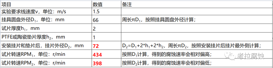 设备不同,配置不同旋转圆盘夹具,则不同直径夹具对应计算出的转速将不一样。即使同一种夹具,公式计算时选取的“旋转圆盘的名义直径”不同,计算得转速不同,由此所得腐蚀速率也会存在差异,举例如下表。