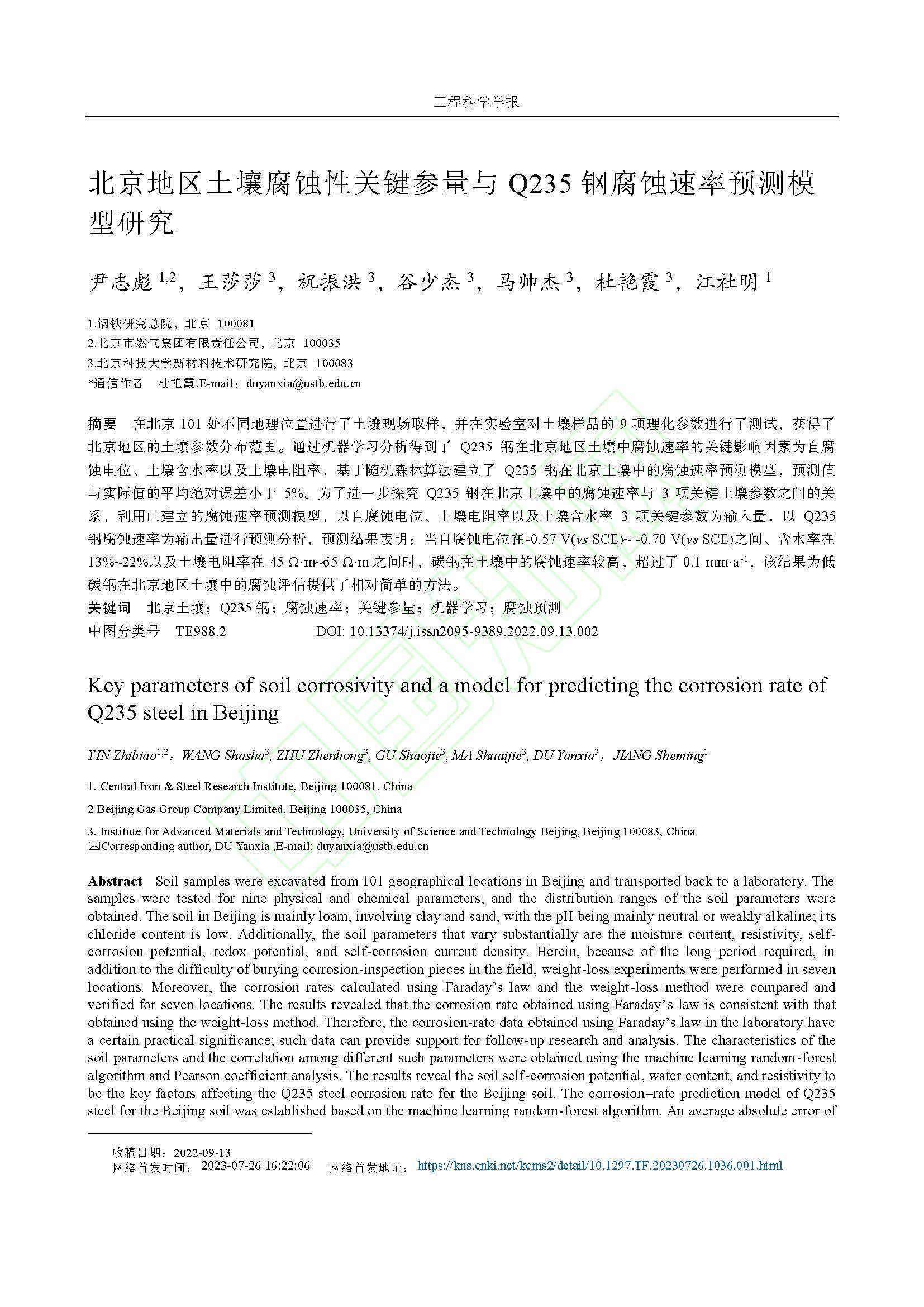 北京地区土壤腐蚀性关键参量与 Q235 钢腐蚀速率预测模型研究