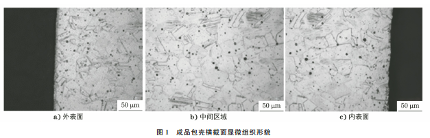 试验材料为304L不锈钢,其铸锭由真空感应+真空自耗双联工艺熔炼而成,包壳的化学成分分析结果如表1所示。包壳的制作工艺为:棒材穿孔→多道次冷轧→退火处理→成品冷拉拔→外表面抛光→内、外表面酸洗处理等,为获得所需的力学性能,在最终固溶退火后,采用冷拉拔工艺使管材的横截面积减少约10%。成品包壳的尺寸(外径×内径)为9.70mm×8.75mm。图1为成品包壳的横截面显微组织形貌,由图1可知,其为典型的奥氏体组织,晶粒尺寸(直径)约为40~50μm,并含有大量的退火孪晶,局部有变形滑移带,包壳的内表面、外表面、中间区域的显微组织基本一致,不存在冷拉拔工艺选择不当造成的内、外表面组织不均匀现象。