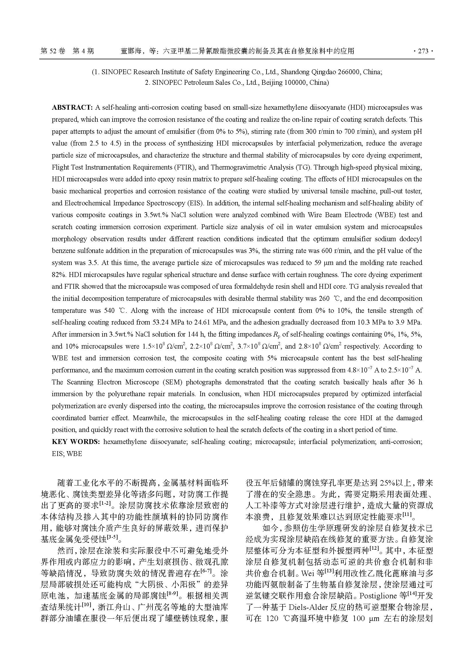 六亚甲基二异氰酸酯微胶囊的制备及其在自修复涂料中的应用