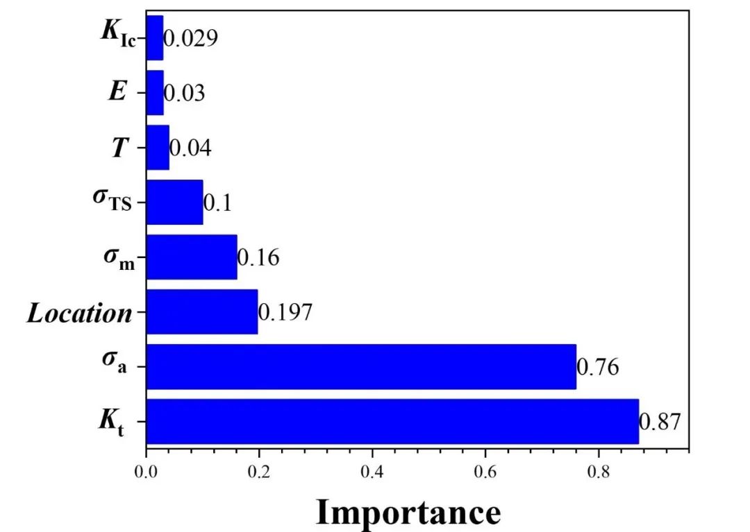 此外,基于提出的机器学习模型开展了TC17钛合金材料高周疲劳寿命的影响因素分析。结果表明影响高周疲劳寿命的因素大致分为三类:试件的属性(取样位置,应力集中系数),加载条件(温度,施加应力,应力比)和材料基本性能(抗拉强度,断裂韧性,杨氏模量)。其中,试件的属性对于材料的疲劳寿命影响最大,随后分别是加载条件和材料基本性能(图3)。
