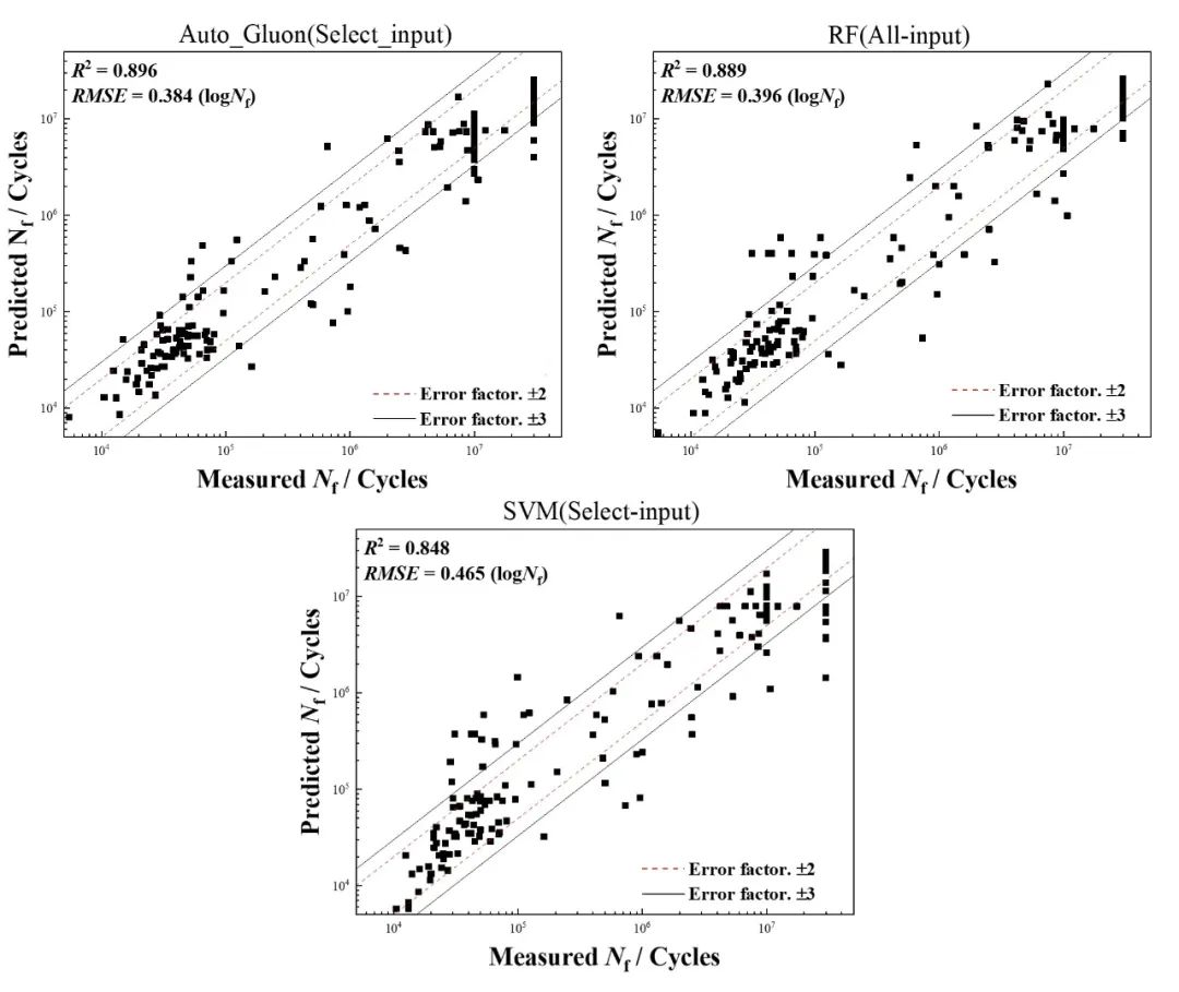 目前,机器学习在疲劳领域中的应用的相关研究中,高周疲劳数据集普遍偏小,且数据的主要来源的不确定性大。相关机器学习算法的训练过程复杂,且考虑的因素较少。本文引入Auto Gluon(AG)机器学习算法,在2492个TC17钛合金高周疲劳实验数据的基础上进行疲劳寿命预测。考虑的因素有温度、应力比、抗拉强度、断裂韧性、杨氏模量、应力集中系数、施加应力以及取样位置共8个因素。基于本团队前期测得的2492个TC17钛合金高周疲劳试验数据开展机器学习模型预测。为验证AG算法的预测精确度,在本研究中将AG的预测精度与常用的机器学习算法随机森林(RF)和支持向量机(SVR)的结果进行了对比。研究表明AG的预测精度优于随机森林和支持向量机的预测精度,超过90%的数据点位于±3倍分散带以内,决定系数R2可达89.6%(图2)。对于确定条件下S-N曲线的预测,AG的预测结果与三参数模型的拟合结果十分接近。