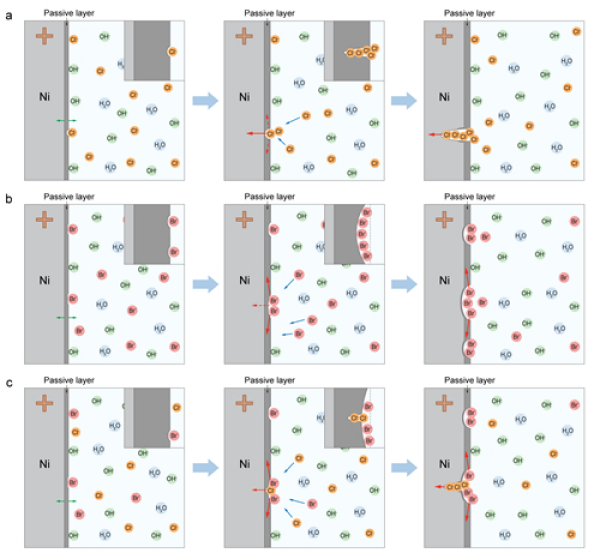 要点1:试验和模拟结果表明,Cl−局部腐蚀,形成窄深凹坑,而Br−广泛蚀刻,形成浅宽凹坑,这可归因于Cl−的快速扩散动力学和Br−的较低反应能。钝化层。