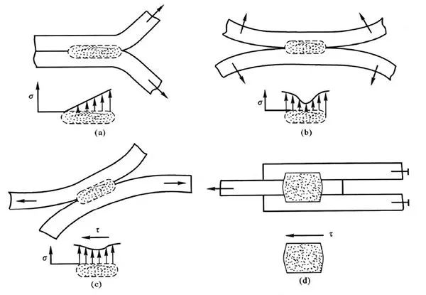 在熔焊接头中,焊缝与母材的过渡处(焊趾)产生应力集中。焊趾是焊接接口中的典型缺口,其缺口应力可以分解为平均应力σm、弯曲应力σb和非线性应力σp。对接接头应力集中系数的大小,主要取决于焊缝余高和焊缝向母材的过渡圆弧半径及夹角,增加余高和减小过渡圆弧半径,都会使应力集中系数增加。T形(十字)焊接接头焊缝向母材过渡较急剧,其工作应力分布极不均匀,在角焊缝的根部和焊趾都存在严重的应力集中。搭接焊缝在只有正面焊缝的搭接接头中,工作应力分布极不均匀,在角焊缝根部和焊趾处都有严重的应力集中。在用侧面焊缝联接的搭接接头中,其工作应力更为复杂。各种焊接接头焊后都存在不同程度的应力集中,应力集中对接头强度的影响与材料性能、载荷类型和环境条件等因素有关。如果接头所用材料有良好的塑性,接头破坏前有显著的塑性变形,使得应力在加载过程中发生均匀化,则应力集中对接头的静强度不会产生影响。点焊焊接接头应力集中程度比电弧焊搭接接头的应力集中程度严重,点焊接头承受载荷时,其焊点周围产生不同程度的应力集中,点焊接头的抗拉强度明显低于抗剪强度,所以在一般使用中,应尽量避免点焊接头承受图2所示载荷。焊接节点部位由于传力方向改变产生复杂的结构应力,结构应力与节点焊缝的应力集中互相叠加。焊接节点的应力集中分析是焊接结构强度设计中需要考虑的重要因素,焊接缺陷是焊接结构中最严重的不完整性,对焊接结构承载能力有显著的影响,并在缺陷周围产生应力集中。