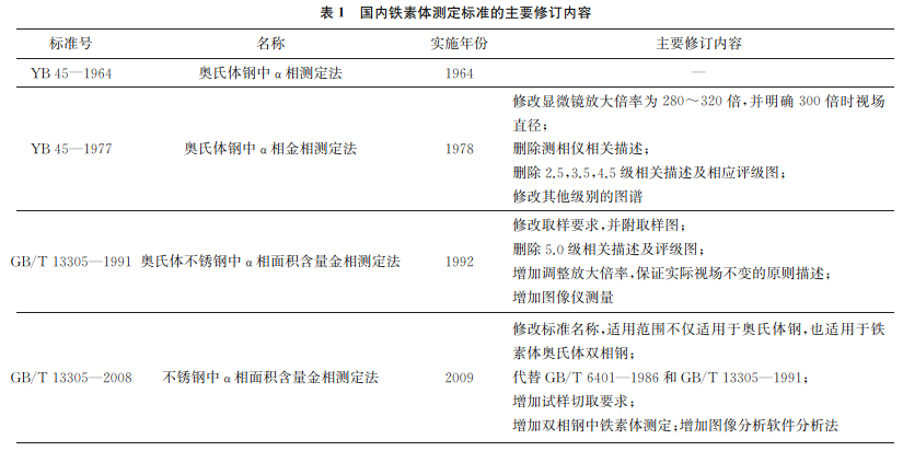 在国内,奥氏体钢中铁素体相面积含量测定的现行标准为GB/T 13305—2008 《不锈钢中α相面积含量金相测定法》,国内铁素体测定标准的多次修订内容如表1所示。主要修订内容以其所代替的上一版标准为基础进行论述,内容的选取参考标准中的修订说明。