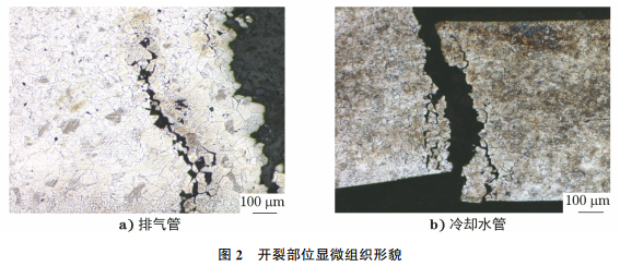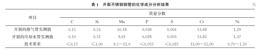 对开裂的排气管和冷却水管进行化学成分分析,结果如表1所示,由表1可知:开裂不锈钢钢管的化学成分均符合技术要求。