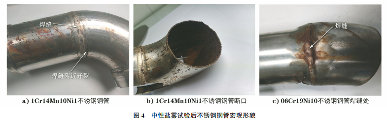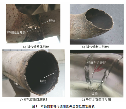 (1)1Cr14Mn10Ni1不锈钢材料排气管、冷却水管在焊接过程中,晶界附近容易析出Cr23C6碳化物,从而导致焊缝附近出现“局部贫Cr”区域,构成大阴极-小阳极的微电池,形成晶间腐蚀,导致焊缝附近局部的材料性能恶化,甚至出现早期断裂。