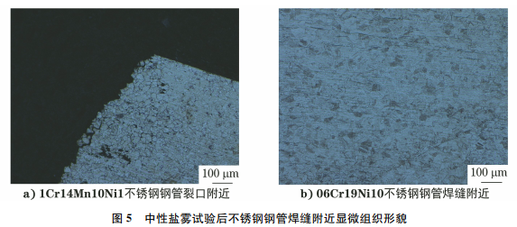 从上述两件经过中性盐雾试验的1Cr14Mn10Ni1和06Cr19Ni10不锈钢钢管焊缝附近取样,用王水腐蚀后,将其置于光学显微镜下观察,结果如图5所示。由图5可知:1Cr14Mn10Ni1不锈钢钢管裂口附近出现沿着晶界的黑色腐蚀产物,06Cr19Ni10不锈钢钢管焊缝附近未出现沿着晶界的黑色腐蚀产物。