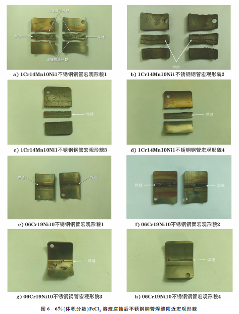 用体积分数为6%的FeCl3溶液对1Cr14Mn10Ni1不锈钢和06Cr19Ni10不锈钢焊接钢管进行腐蚀,焊缝附近局部贫Cr程度不同,导致其耐腐蚀程度差异明显,因此也可以用该方法直观、快速地鉴别焊缝附近局部贫Cr的程度。