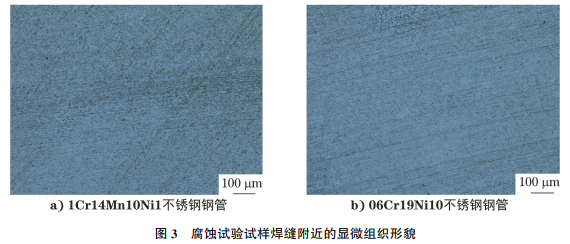 从1Cr14Mn10Ni1和06Cr19Ni10两种不锈钢材料焊接的钢管焊缝附近取样,两种材料规格分别为75mm×1.5mm(外径 × 壁厚)、89mm×1.5mm(外径×壁厚),用王水腐蚀后,将其置于光学显微镜下观察,结果如图3所示。由图3可知:焊缝附近均未发现沿着晶界的黑色腐蚀产物和开裂现象。