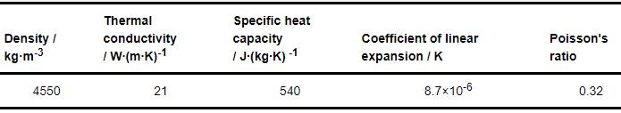 图4a给出了实验过程中温度最高时试样内部的温度分布。可以看出,二者的温度分布类似,均由中心向外圈逐渐递减。不锈钢的温度略高于钛合金,因为不锈钢的导热系数和比热容较小。表3和表4列出了443铁素体不锈钢和TC1钛合金的热物理参数。图4b给出了冷却后钛合金和不锈钢试样内部的残余应力分布。可以看出,不锈钢试样中心的残余应力较大且为拉应力,而钛合金试样则是外围存在较大残余拉应力。其原因是,不锈钢的线膨胀系数大于钛合金,且不锈钢中的温度高于钛合金,使不锈钢受热膨胀时产生较大的形变,但是这种膨胀趋势受到周围模具和钛合金试样的阻碍,使不锈钢试样中心产生可达1122.1 MPa的压应力。较高的温度使不锈钢试样中心产生的压缩变形(1122.1 MPa)超过了不锈钢的屈服极限(σb=483 MPa),于是产生了压缩塑性变形。因此,当温度冷却至室温时,若不锈钢试样中心处自由收缩则体积必然减小,而外圈不锈钢阻碍试样中心的自由收缩,使不锈钢试样的中心受拉而产生较大的残余拉应力。钛合金因反作用力产生与不锈钢相反类型的应力,于是钛合金/不锈钢复合试样中形成了一个平衡的残余内应力体系并长期存在。