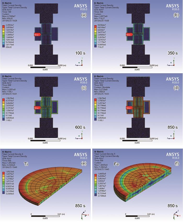 图2给出了SPS连接过程中的电流密度分布云图。可以看出,试样处的电流密度其数值远大于模具的电流密度值,纵向上模具直径的增大使电流密度的减小;横向上石墨的电阻远大于钛合金和不锈钢试样,在并联状态下更多的电流流过试样[16]。模具与压头的接触部位及尺寸形变较大处的电流密度较大,因为电流倾向于通过试件的缝隙和表面[17]。图2e~f给出了模拟过程中试样的电流密度分布。可以看出,钛合金试样中的电流密度整体大于不锈钢,两者内部的电流密度均出现明显的梯度,由外表面向中心递减。