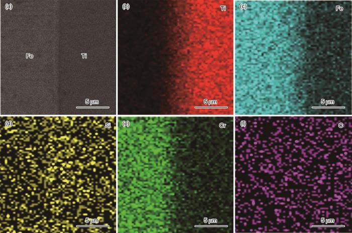 图 5 用放电等离子烧结技术连接的钛合金和不锈钢结合界面的微观形貌和面扫描图