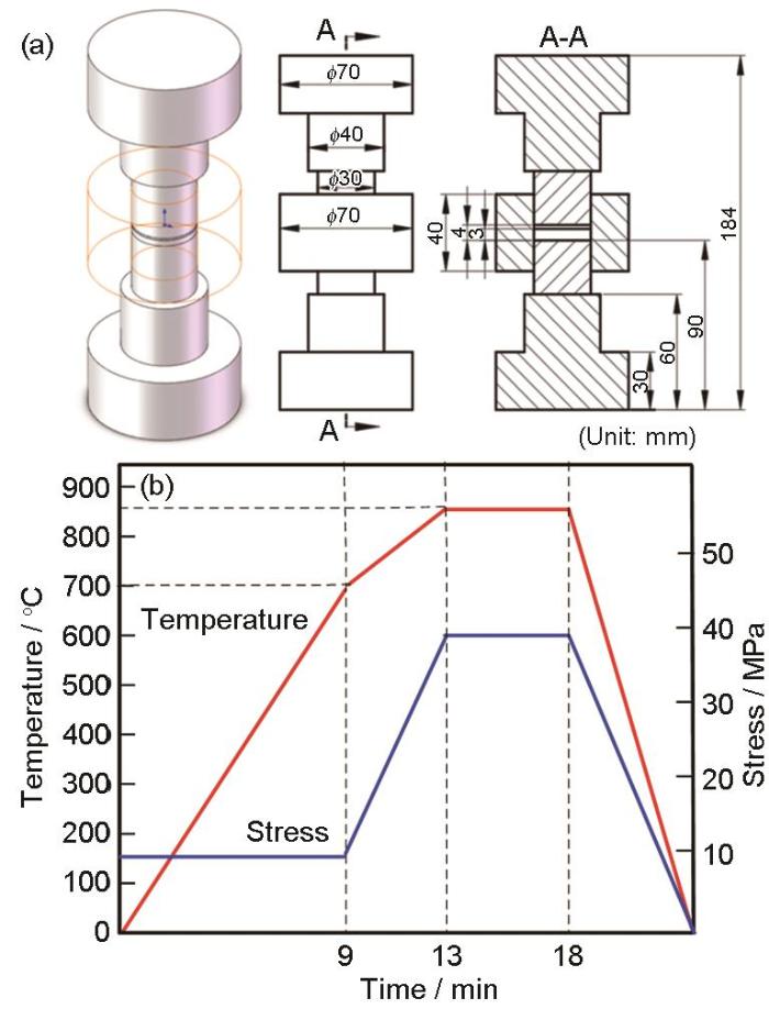 用放电等离子烧结技术(SPS-331LX, Dr Sinter) 连接钛合金/不锈钢。先将钛合金/不锈钢(Ra<0.2)圆片置于石墨模具内,从模具上下压头导入高能脉冲电流,在距离石墨模具内壁2 mm处用热电偶测温,调整脉冲电流参数使热电偶测温最高电流处理温度为1123 K,脉冲电流占空比为4∶5,连接过程中真空度≤5 Pa。为了使连接界面更为紧密,初期加载压力较小为10 MPa,以最大限度地实现连接界面处的微弧放电,进而去除板材表面的致密氧化膜;保温阶段的加载恒定压力为40 MPa。SPS连接复合板的示意图及工艺曲线,如图1所示。