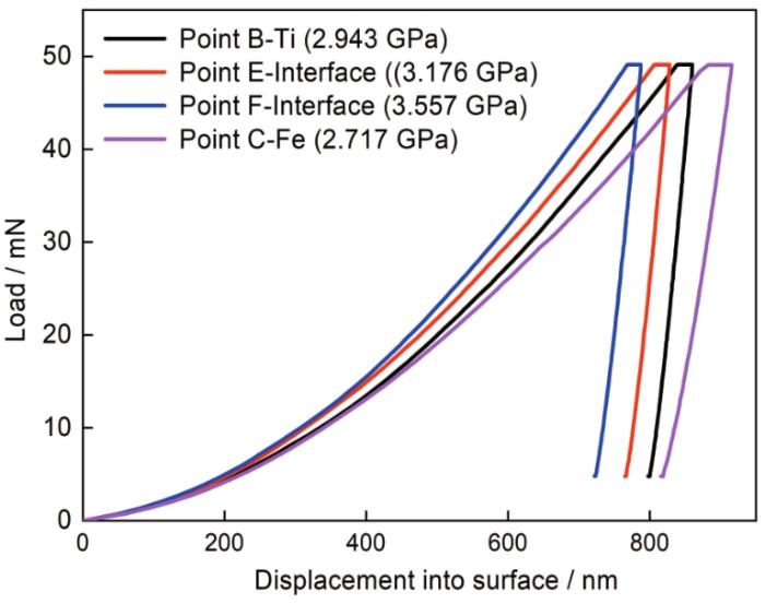 钛合金/不锈钢连接界面处存在元素扩散及化学反应,界面处的显微硬度必定与两种基体不同。测试界面处的B、E、F和C点的显微硬度,每个测试点测试三次并取平均值,结果列于如表6。从图9可以看出,在50 mN的载荷作用下,C点的压入深度最大,意味着443铁素体的显微硬度最低;B点对应TC1钛合金的基体硬度。E、F点对应的界面处存在TiFe类金属间化合物,使其显微硬度数值高于基体。
