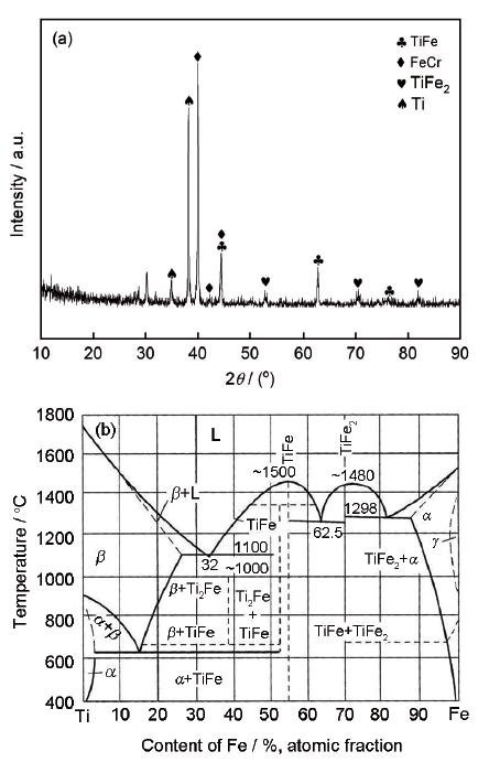 图8 钛合金/不锈钢连接界面的XRD谱和钛-铁二元相图