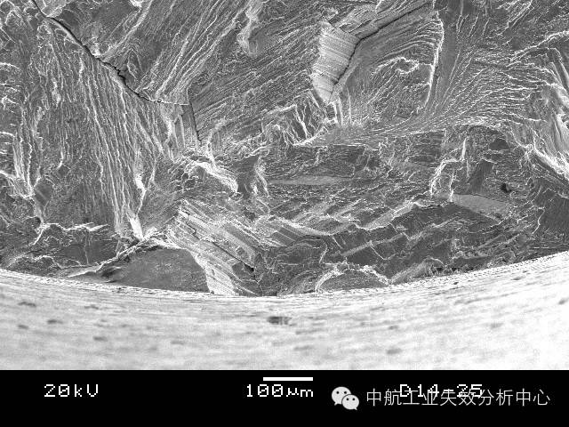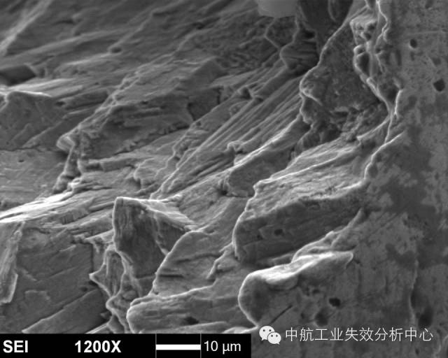 材料在受到低于断裂强度的交变应力作用下,发生的脆性断裂,称之为疲劳,常可见疲劳条带(或称疲劳辉纹)的典型特征。 对于疲劳源区而言,最简单的是收敛类源区: 源区附近呈放射性,其收敛位置即为源区。 源区附近呈弧线式,其圆心位置即为源区。 这类源区附近的断面一般较为平坦,之后断面的起伏度和粗糙度均会增大。收敛类的疲劳起源占疲劳失效的较大比例,另一种情况,疲劳源区则为解理面或准/类解理面交错,常见于铜合金和高温合金,部分钛合金也有该情况。 高温合金源区的解理特征 铜合金源区的类解理特征 钛合金源区的解理特征 这类的源区附近断面由于交错分布多个解理面,因此比较粗糙,之后的疲劳扩展前、中期则会转为平坦,最后失稳后的快速扩展又重新变得起伏大和粗糙。此外,有些疲劳并不一定从试样表面起源,有可能在试样内部,此时往往可能由于内部存在缺陷或亚表面处于特殊应力状态导致。 有的起源也不仅仅在一处位置起源,可能在多个位置均萌生疲劳源,这时我们就可以看到多个疲劳源之间产生类似台阶的特征,这是由于多处萌生裂纹并扩展过程中,不可能在一个平面上扩展,当裂纹相互交汇到一起时,必然通过剪切撕裂的方式使不同的扩展平面连接起来,从而形成台阶。 试样边缘多个交汇台阶 以上说了这么多,大家是不是反而晕菜了?怎么好像什么模式都有,我们到底应该如何判断? 首先,当然是通过棱线的收敛去判断,毕竟绝大多数的疲劳都有该特征。 其次,看看是不是铜合金、高温合金这种特殊的合金,对于他们来说,找解理面就差不多了。 再次,关注台阶,台阶必然意味着有多条裂纹交汇在一起,也就是说,一个台阶的两侧存在源区的可能性很大。 然后,我们还有几个辅助判断的手段: 第一,条带方向。几乎所有的疲劳断裂都可以观察到条带特征,此时,条带弧线的圆心位置,就是指向源区了。但是,需要注意的是,条带只是极微观的特征,而且在局部位置由于应力改变,可能造成条带扩展方向转变的情况。因此,该方法只能作为辅助判别手段。 第二,瞬断区判别。源区实在不好找,可以先去找瞬断区,因为瞬断区往往以韧性断裂模式为主,一般可见与疲劳区不同的韧窝特征。此外,瞬断区由于主要在剪切力作用下快速断裂,一般与主断面存在一定的倾斜角度,比较好辨别。找到瞬断区后,与之相对的位置一般就是源区了。 该断口左侧即为瞬断区,由此推出右侧为源区 看到这儿,大家是不是觉得又明白了一些呢?那么下面我们来检验一下自己吧:请问下图断口的源区在哪?有几处源区?