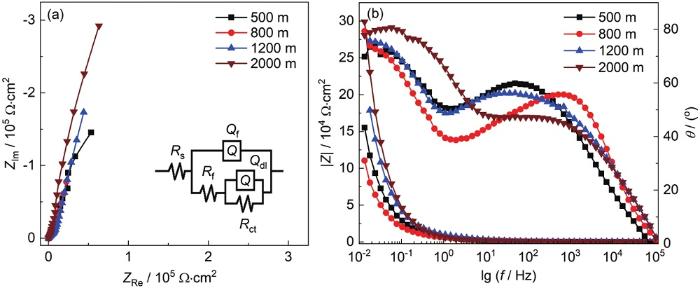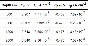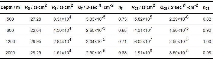 表2中结果显示,与500 m条件相比,800 m时的电荷传递电阻有所增大,2000 m时显著增大,是500 m下的328倍,表明5A06铝合金的耐蚀性能随深度增加而增大。低频处的nct随海水深度增加而有所增大。金属氧化物/氢氧化物的交流阻抗谱相关研究显示,n<1是由弥散效应引起,可能与多种不同的物理化学现象有关。Pajkossy[16]认为,原子尺度上的不均匀性,不同的晶体结构或者缺陷,以及表面吸附特性等,导致了电极界面电容的局部变化,从而引起了电极的n<1行为。Casta等[17]则认为,电极的微观形貌特性,例如电极表面的粗糙程度、多孔性和非均一性等,诱导产生了电极的常相位角行为。深海环境中,在海水压力、Cl-、溶解氧和温度等多种因素的共同作用下,试样表面形成非均匀分布的致密钝化膜层,与海水接触后,由于不同海水深度下钝化膜层的均匀程度存在差异,从而引起了铝合金表面的电化学过程发生变化。因此,可以认为,5A06铝合金表面不均匀的钝化膜层引起了金属/海水界面的常相位角行为。同时,随深度增加低频n值逐渐增大的实验结果表明,随着海水深度的增加,金属/海水界面的理想电容特性增加,钝化膜层的均匀性逐渐升高,从而导致5A06铝合金耐腐蚀性能增强。