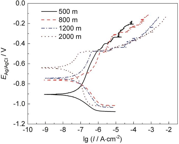 图6为5A06铝合金在实海投放1 a后测试的极化曲线,可以看出,随着投放深度增加,腐蚀电位呈正移趋势:500 m时约为-0.907 V (vs. Ag/AgCl), 800 m时上升到-0.762 V,2000 m时则进一步正移至-0.640 V。5A06铝合金的阳极极化曲线呈现钝化-溶解特征,随着阳极电位不断增大进入钝化区,Al、Mg、Mn等金属元素失去电子,形成钝化膜,随着金属腐蚀溶解的进行,有可能进一步形成金属氢氧化合物,如Al(OH)3和Mg(OH)2等。一般来讲,点蚀电位越正,点蚀发生越困难,5A06铝合金耐点蚀性能越突出。500 m深度铝合金试样的点蚀电位较正,约为-0.482 V,维钝电流密度约为7.89×10-7 A/cm2;800~2000 m深度下5A06铝合金的点蚀电位则变化不大,在-0.47~0.48 V范围,但维钝电流密度则随深度增加而减小,其中800 m深度试样的维钝电流密度为1.23×10-7 A/cm2,而2000 m深度则为7.52×10-8 A/cm2,表明2000 m深度下5A06铝合金的耐点蚀性能最为优异。