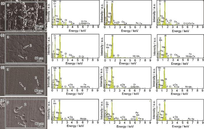 为了对比500、800、1200和2000 m深海环境中5A06铝合金试样上不同区域处的成分,如图3所示,分别选取试样上膜层保持的相对完整处为各个深度下EDS的谱图1,腐蚀的较严重处为各个深度下EDS的谱图2,选取视野内大范围的区域为谱图3。通过表1和表2可以看出,试样表面较为平整的区域与腐蚀相对严重的区域成分含量略有不同,其中4个深度下谱图1中O原子分数要低于谱图2中O原子分数,即较为完整膜层中的O原子分数更高一些,而Mg和Al的原子百分比则恰恰相反,在谱图1中明显更高一些。这可能是因为5A06铝合金表面的钝化膜中,形成了金属氢氧化合物,如Al(OH)3和Mg(OH)2。当钝化膜受到破坏后,金属氢氧化合物分解溶于溶液中,造成Al和Mg的流失,Cl-等侵蚀性粒子穿过破裂的腐蚀产物膜接触铝合金基体产生腐蚀反应,所以在谱图2腐蚀产物处Cl原子分数要较谱图1高。除此以外,在500 m深度下明显可见其腐蚀产物较多,2000 m深度下谱图2处则是有部分夹杂物聚集在转化膜表面的凹坑内,对其成分分析,发现比其他未出现明显腐蚀产物的谱图成分中多了S,在500 m深度中,腐蚀部位的S原子分数达到0.6%,其附近的膜层中S原子分数达到0.49%,2000 m深度下只在谱图2中出现S,谱图1相对较为完整涂层中则未出现。这可能是因为海水中的SO42-与Cl-增加了晶格缺陷的密度,并促进击穿由氧化层提供的势垒。另外根据Ca和Mg的原子分数,可推测在腐蚀产物层中存在部分的钙镁沉积物。