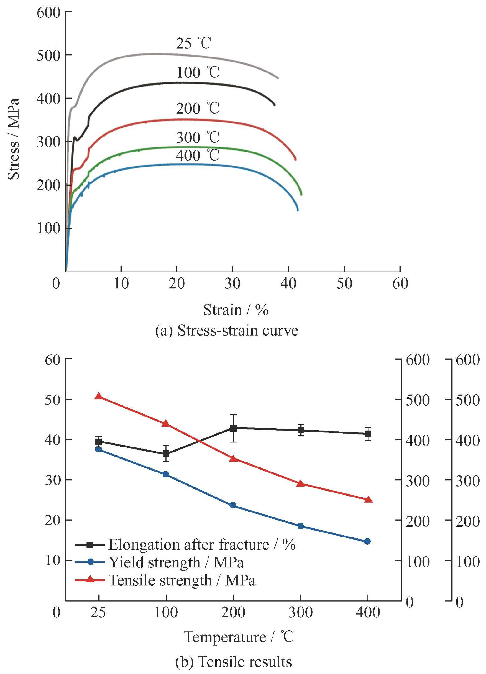 涂层管在 5 种温度下的拉伸应力应变曲线与拉伸结果对比(包括断后延伸率、屈服强度及抗拉强度,屈服强度及抗拉强度的误差较小,因此误差棒在图中不明显)如图4 所示,其中室温与高温拉伸的屈服强度以规定塑性延伸强度 Rp0.2 计算。