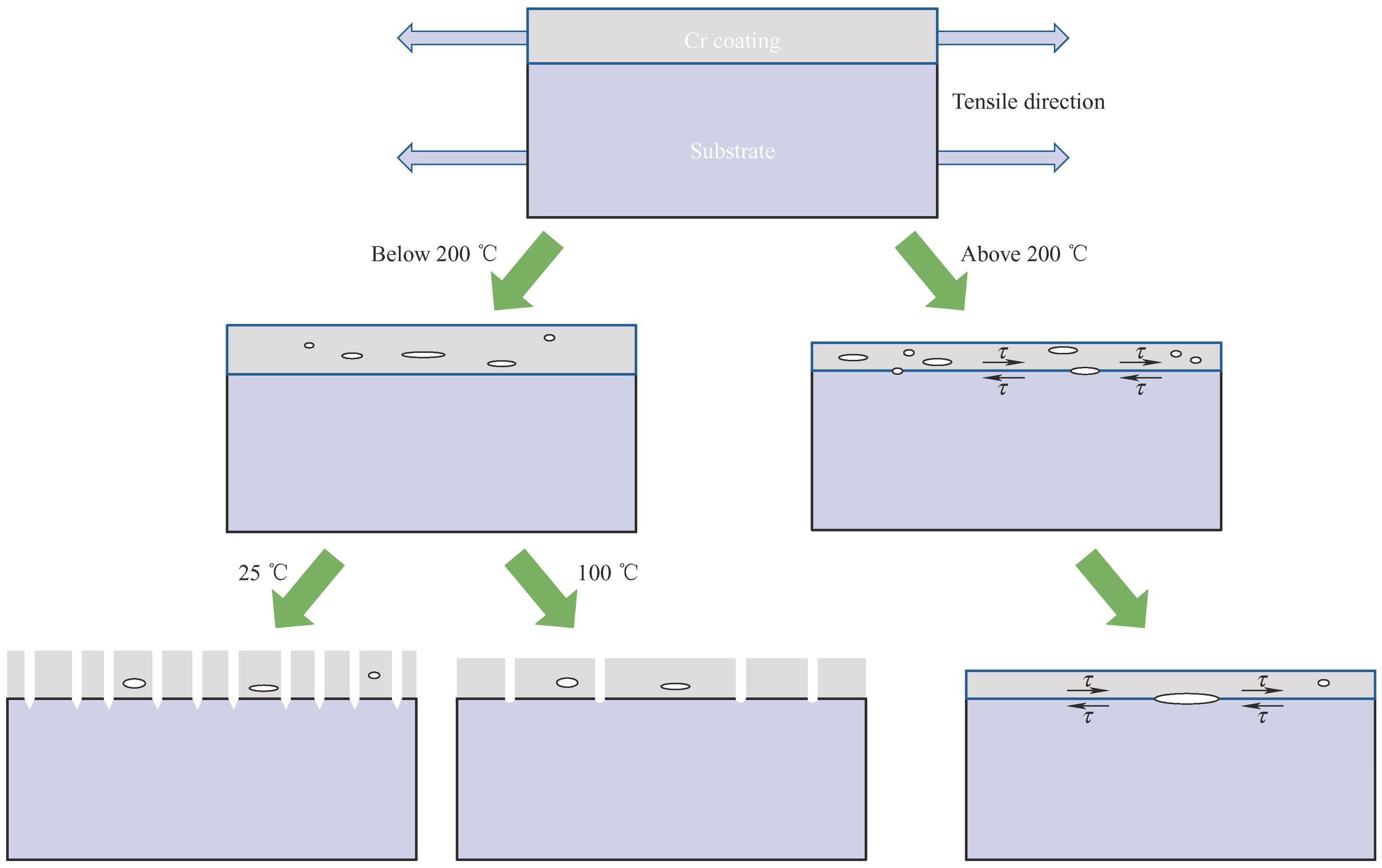 基于上述试验结果进行分析,如图8 所示,在不同温度下,Cr 涂层的裂纹的萌生位置与扩展行为存在显著差异。室温下锆包壳表面多弧离子镀 14 μm Cr 涂层的膜基体系是一种典型的脆性涂层韧性基体体系,在拉伸载荷作用下,涂层发生脆性断裂。涂层在制备过程中可能存在部分细微缺陷,拉伸过程中缺陷位置容易造成局部应力集中,使得涂层柱状晶粒变形破碎[20],而其他晶粒在室温下的塑性变形能力不足,最终表现为在涂层内部形成平行于拉伸方向的微小孔洞。当应力增大到超过涂层的抗拉强度时,微裂纹便从孔洞或其他薄弱晶界处产生,同时涂层横向存在较多不同方向的晶界会阻碍裂纹的扩展,而涂层单个柱状晶在纵向上提供了一个几乎贯穿整个厚度方向上的晶界,因此微裂纹沿着涂层柱状晶界扩展至表面形成宏观裂纹。裂纹到达涂层表面后,相邻位置裂纹聚集生长,逐渐形成环形裂纹。而裂纹扩展至膜基界面后,会因为涂层结合性能的不同出现不同扩展方向,一是涂层结合性能很差时,裂纹沿着膜基界面扩展,使膜基界面分层,甚至导致涂层剥落;二是涂层结合性能一般时,涂层裂纹既向基体扩展也沿界面扩展;三是涂层结合性能较好时,涂层裂纹扩展至基体,室温下 Cr 涂层则为第三种情形。