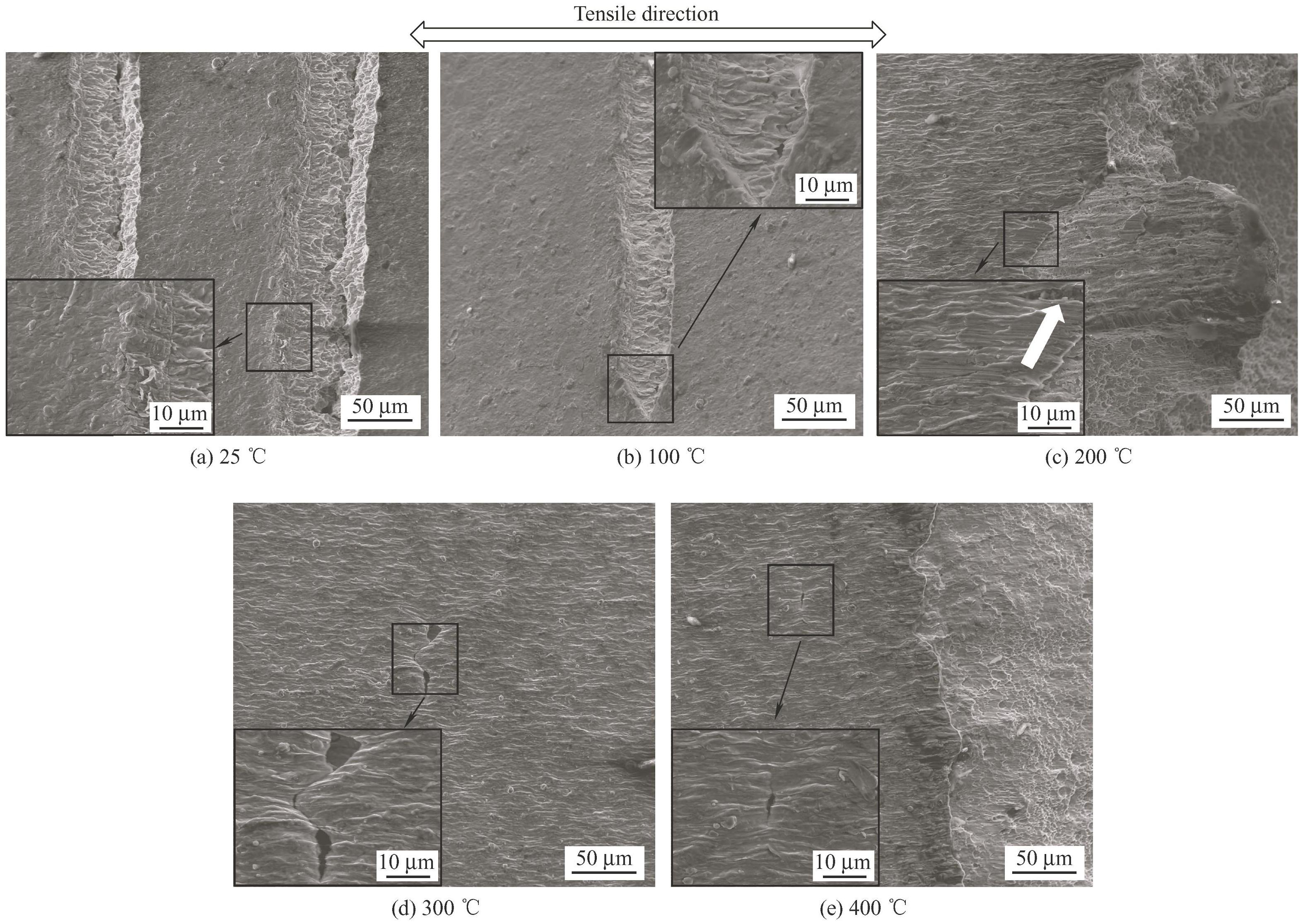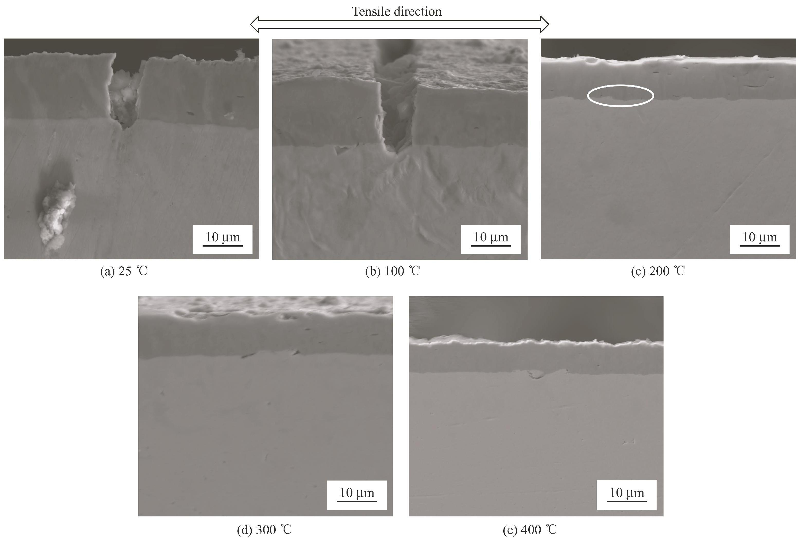 如图6a 所示,室温下锆合金基体存在大量韧窝,呈现典型的韧性断裂特征,表明基体的塑性较好,与 2.2 节的拉伸试验结果吻合。涂层的组织为垂直于基体表面的柱状晶,且与基体结合良好,在室温下呈脆性沿晶断裂。在图6b 中,100℃下涂层表面的裂纹数量减少,且开裂方式保持不变。当温度升高到 200℃时,如图6c 所示,涂层表面的裂纹形貌与室温下不同,断口附近裂纹(箭头处)呈扁平状且长度减小,由于裂纹尺寸较小且开口处边缘较为圆润,未观察到明显的涂层边缘晶粒形貌。由于严重的塑性变形,涂层表面呈现出流线形,与 KUMAWAT等[19]研究的Si-Fe-Cr涂层高温拉伸后的表面形貌类似,这也说明随着温度升高,涂层的塑性提高,其开裂方式逐渐由脆性断裂转变为韧性断裂。如图6d 所示,300℃下涂层有更好的塑性变形能力,随着持续施加拉伸载荷,其表面出现微裂纹,裂纹开口在 3~10 μm,同时还观察到两个相邻的微裂纹之间通过相互扩展发生聚集。如图6e 所示,裂纹开口随着温度升高逐渐减小,400℃时,裂纹开口减小至 1 μm 左右。