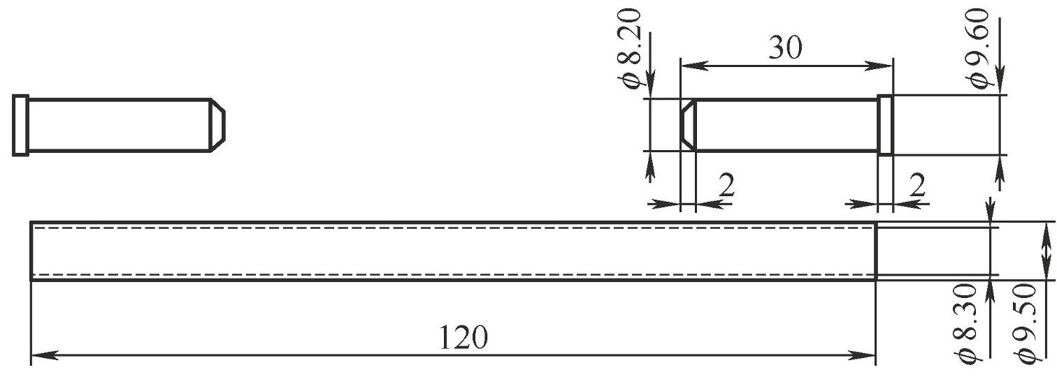 拉伸试验在 WDW-100C 万能试验机上进行,试验温度分别为 25、100、200、300、400℃,每种温度重复 3 次,拉伸应变速率为 0.002 / s。拉伸试样设计如图2 所示,考虑到管状样品夹持问题,在锆包壳 Cr 涂层管(简称涂层管)两端各加总长度为 30 mm 的塞头,以防止夹持端变形对拉伸过程产生影响。