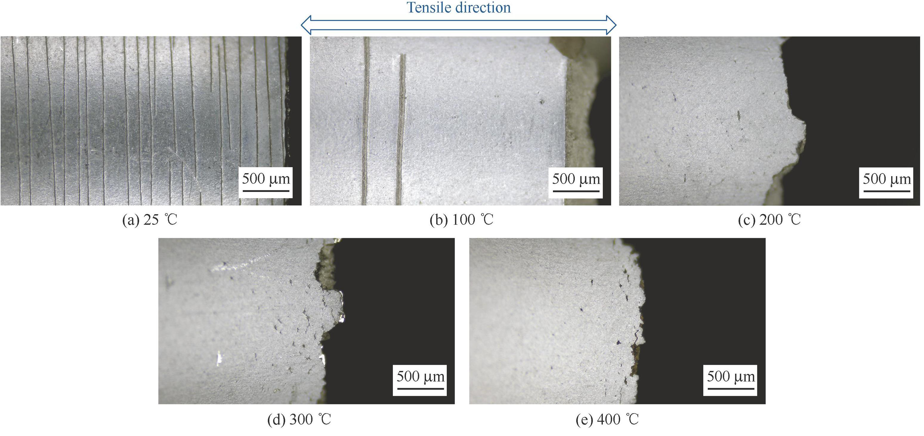 涂层管在不同温度下拉伸断口位置处的表面裂纹宏观形貌如图5 所示。室温与高温拉伸后断口附近涂层与基体结合良好,且均未出现大面积剥落,表现出优异的膜基结合力。由图5a 可知,室温下涂层管表面观察到大量垂直于拉应力方向的环形裂纹,且裂纹密度最大。相邻两条裂纹之间的宽度(简称裂纹宽度)较小,平均裂纹宽度约 230 μm,单条裂纹开口平均约 16 μm。除完整的环形裂纹外,在两个相邻裂纹间有新的裂纹,由于 Cr 涂层晶界的阻碍作用,并未沿周向扩展形成完整的环形[18]。由图5b 可知,当温度升高至 100℃时,涂层表面裂纹数量大幅度减少,同时裂纹宽度增大到约 500 μm,单条裂纹开口增大到约 65 μm,这表明 100℃下 Cr 涂层的塑性变形能力与抗裂性能较其在室温下有一定提升。如图5c~5e 所示,在 100℃以上温度下,涂层表面无法观察到具有明显方向性的裂纹,只在靠近断口位置附近出现少量微裂纹,裂纹相对较小且分离,不是细长而平行。