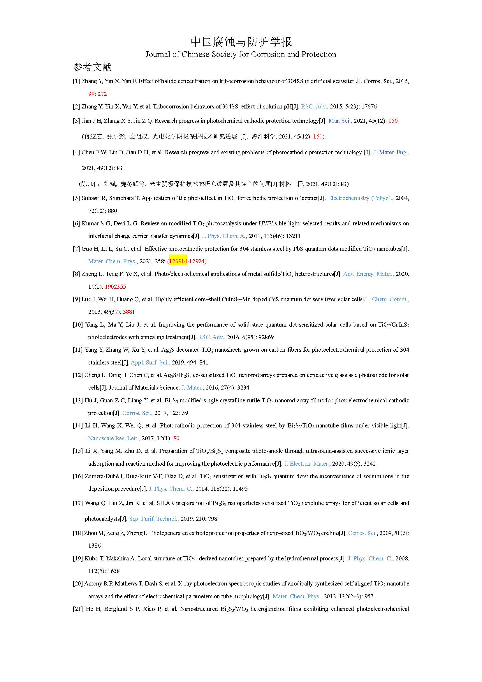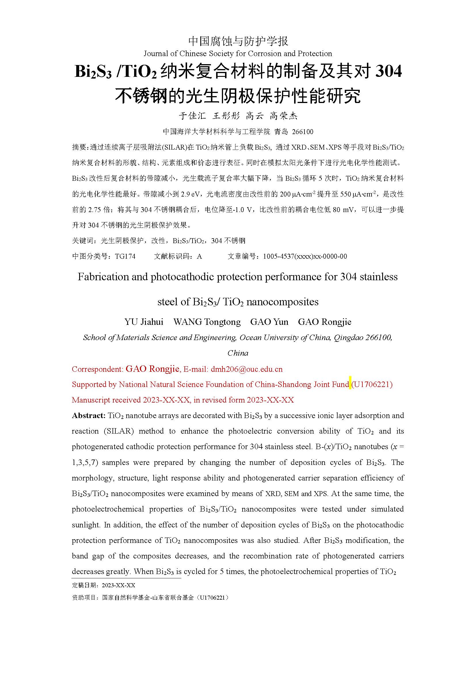 标签: 光生阴极保护, 改性, Bi2S3/TiO2, 304SS