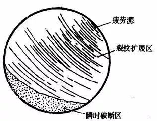 疲劳断口:疲劳破坏能清楚地显示出裂纹的发生、扩展和最后断裂三个组成部分。