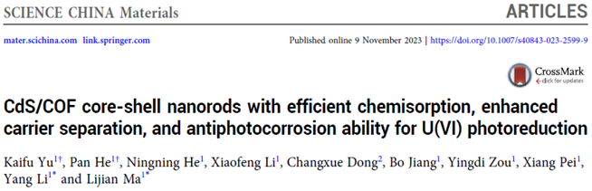 Yu K., He P., He N. et. al. CdS/COF core-shell nanorods with efficient chemisorption, enhanced carrier separation, and antiphotocorrosion ability for U(VI) photoreduction. Sci. China Mater. (2023).