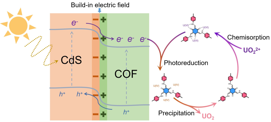 1) COF壳层不仅为U(VI)提供了化学吸附位点,降低了U(VI)还原的活化能,而且在与CdS核的界面处形成了内建电场,促进了载流子的分离。