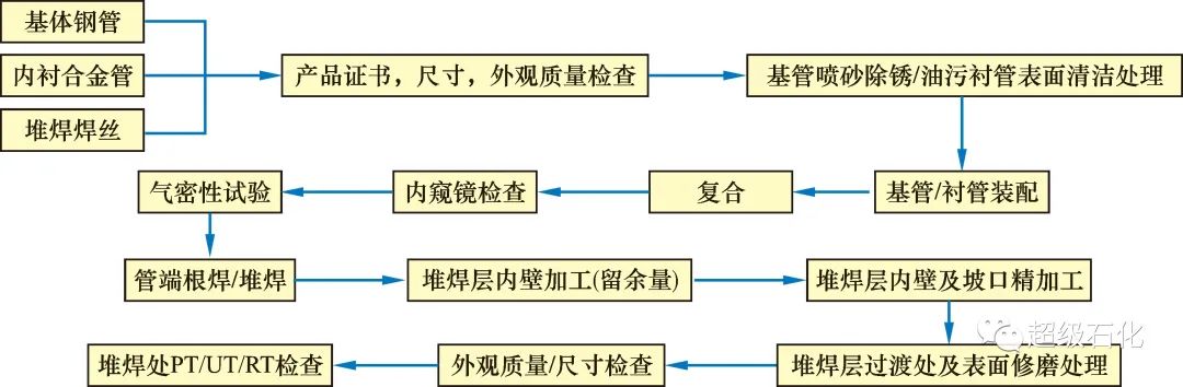 双金属复合管分为机械复合和冶金复合,其中以机械复合居多,即将碳钢基管和不锈钢管穿在一起采用水压、爆炸及旋压等方法生产,工艺流程如图1所示。