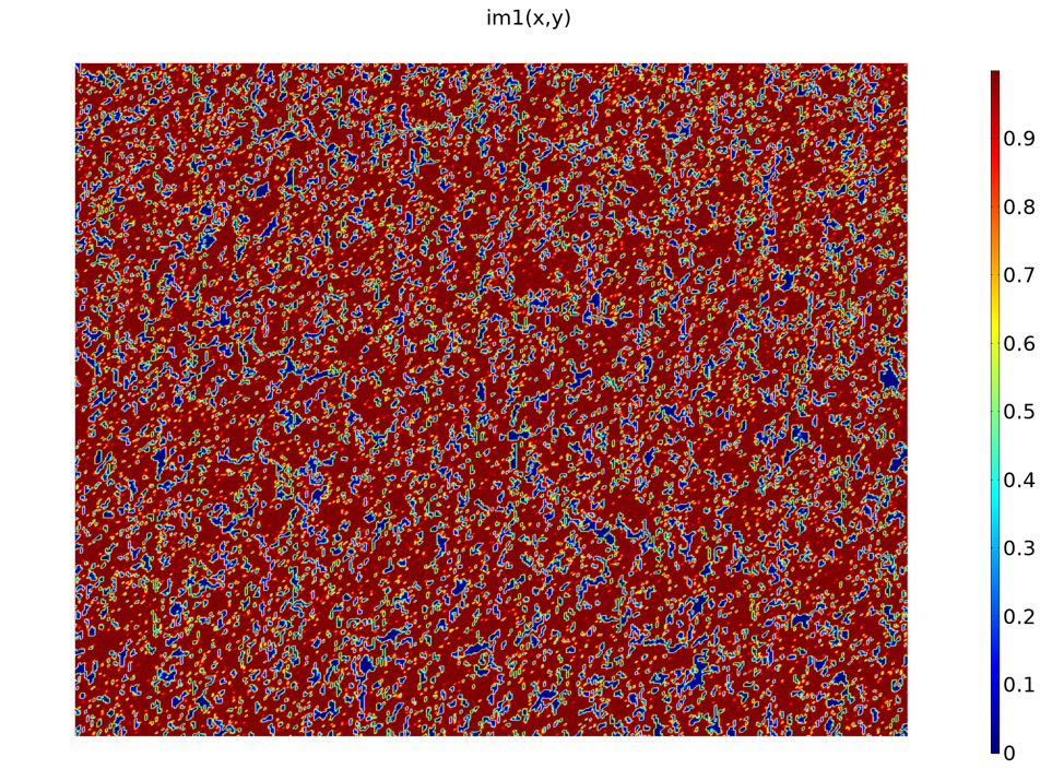 图3. 导入 COMSOL Multiphysics 中的图像,其中包含固体(红色)与孔隙(蓝色)之间的连续相。使用尖锐的阶跃函数,可以消除过渡相。