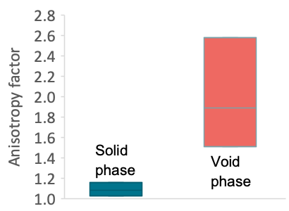计算一个方向上的传输,就可以评估样品的各向异性(图5)。在我们的研究中,孔隙相的各向异性远高于固相的各向异性(图6),因此,在某些应用中,石墨片的取向显著影响材料的使用寿命。同样,这些材料密度的微小变化都可能会极大地影响材料的渗透性和扩散性。