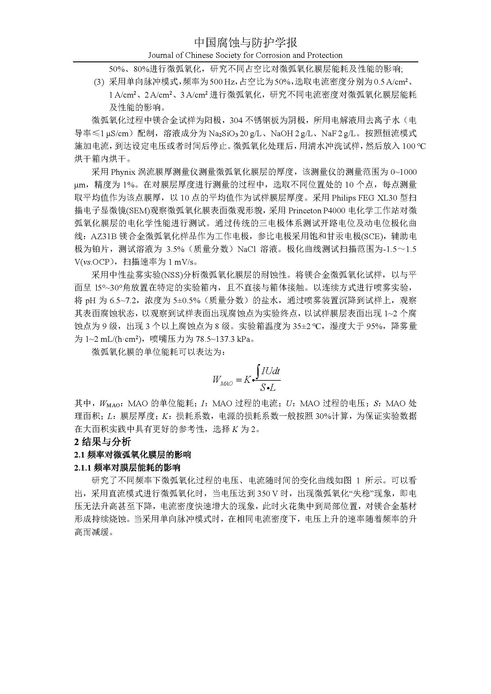 电参数对AZ31B镁合金微弧氧化膜能耗及耐蚀性的影响